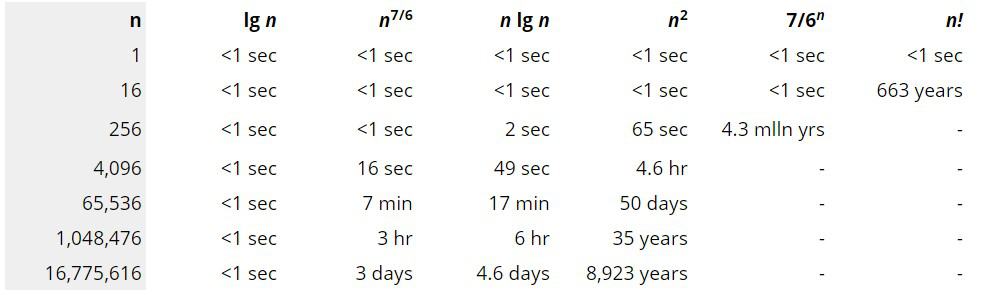 Algorithms with lower time complexity (such as O(n lg n), the third column) increase with bigger data sets, but only relative to their complexity. Whereas the more efficient algorithms can handle a data set size of 16 million in under a period of a few days, it very quickly exponentially grows to millions of years (and eventually to numbers too big to list here). Big O Notation is a convenient way to express the complexity and computational complexity of a particular algorithm without having to dive deep into how the algorithm works – you can just say it operates in O(n!) time, and people can immediately know if they can throw a big data set in and expect your algorithm to be able to handle it within a reasonable time period, or if they’ll be waiting a few centuries before it finishes.